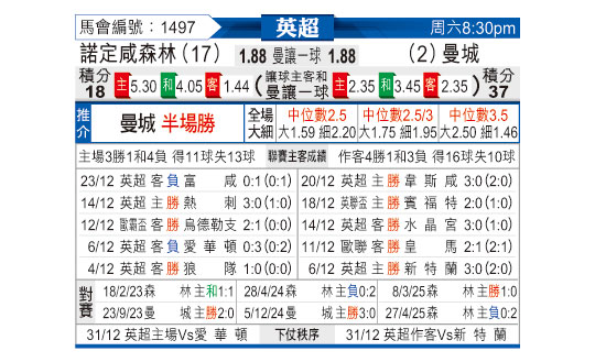 [英超] 诺丁汉森林vs曼彻斯特城